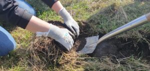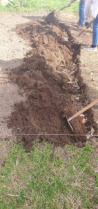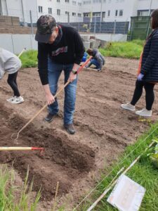 Zuerst wurde die Grasnarbe abgetragen und danach wurde emsig die Erde umgegraben. Alle Eltern und Lehrer bearbeiteten mit viel Spaß und Enthusiasmus mit ihren Schaufeln den Boden- da wäre jeder Maulwurf blass vor Neid geworden!